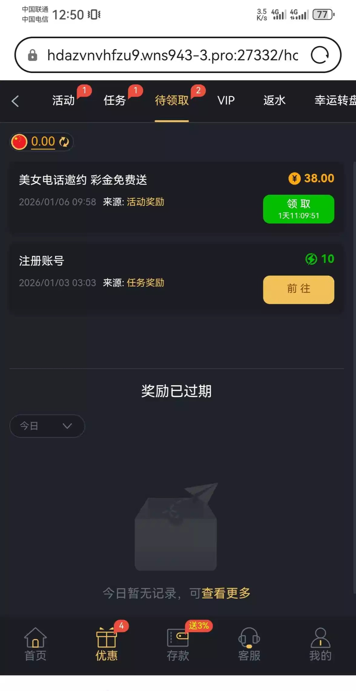 我是3号注册的,今天就打电话过来说电话特邀彩金,登录就有的,我没有充值过,老哥可以去登录碰一下,祝碰到的老哥发大财